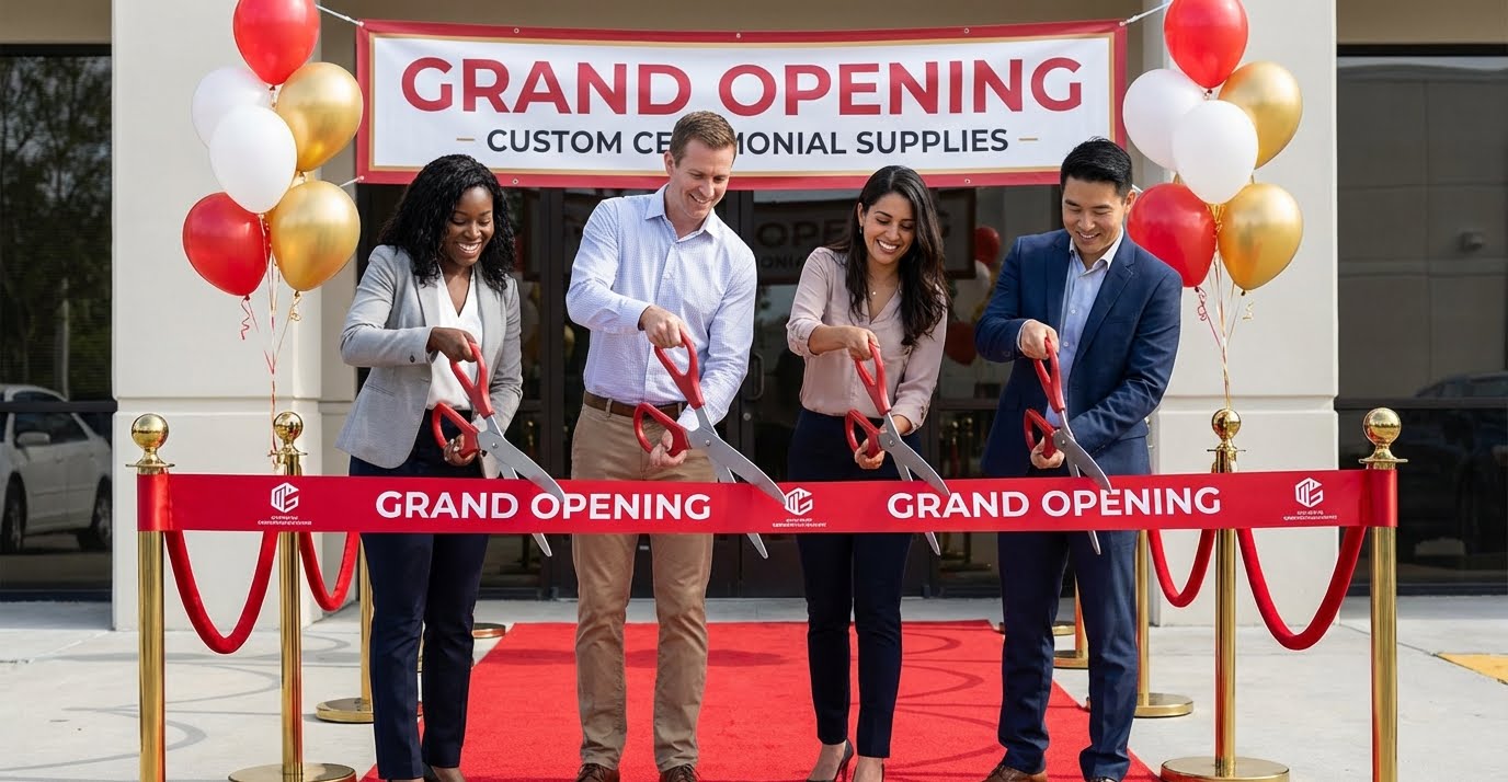 The most comprehensive set around for grand opening ribbon cutting ceremonies, this set comes with a ceremonial carpet available in sizes ranging from 3 feet by 10 feet to 6 feet by 30 feet and every combination in between in increments of 5 ft in length, a pair of brass stanchions standing 41 inches tall and weighing 17 pounds, a 30 inch giant scissor with the words 'Grand Opening' printed on it, a printed ribbon measuring 12 yards by 6 inches, two 8 inch pull bows (easy to assemble for maximum convenience), and a pack of 10 assorted color balloons (11") with 'Grand Opening' printed across them.