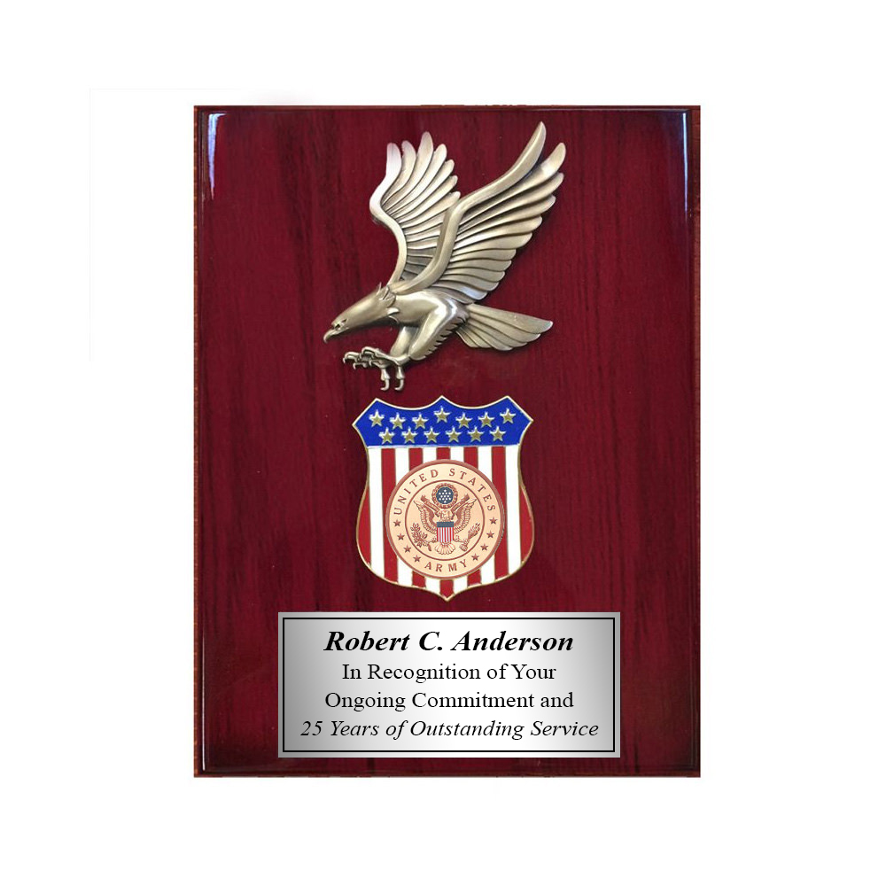 This elegant and stylish American Eagle award plaque is a great way to welcome home a military hero, or to celebrate and acknowledge a special occasion. Be it a promotion, a homecoming, a birthday, retirement or simply a way to recognize achievements, this plaque features the symbols of the US - the eagle, and the US shield, and is designed for personalization with up to 5 lines of text for a special message, or commemorative details. Welcome home a hero the way he/she deserve to be honored.