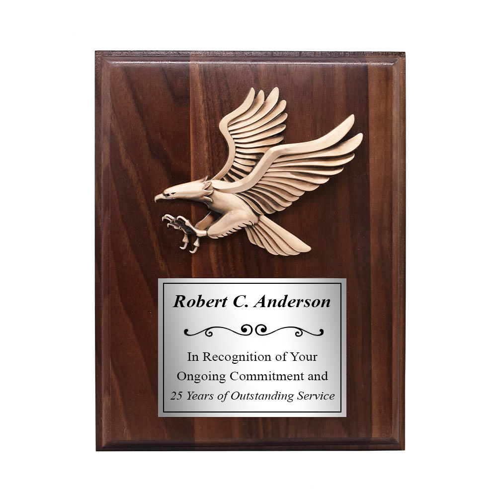 The American Flag and Eagle Plaque measures 8 inches by 10 inches and features a classic walnut finish. Features a 6 inch by 8 inch digital photo of an American flag and bald eagle with room at the top for custom text.