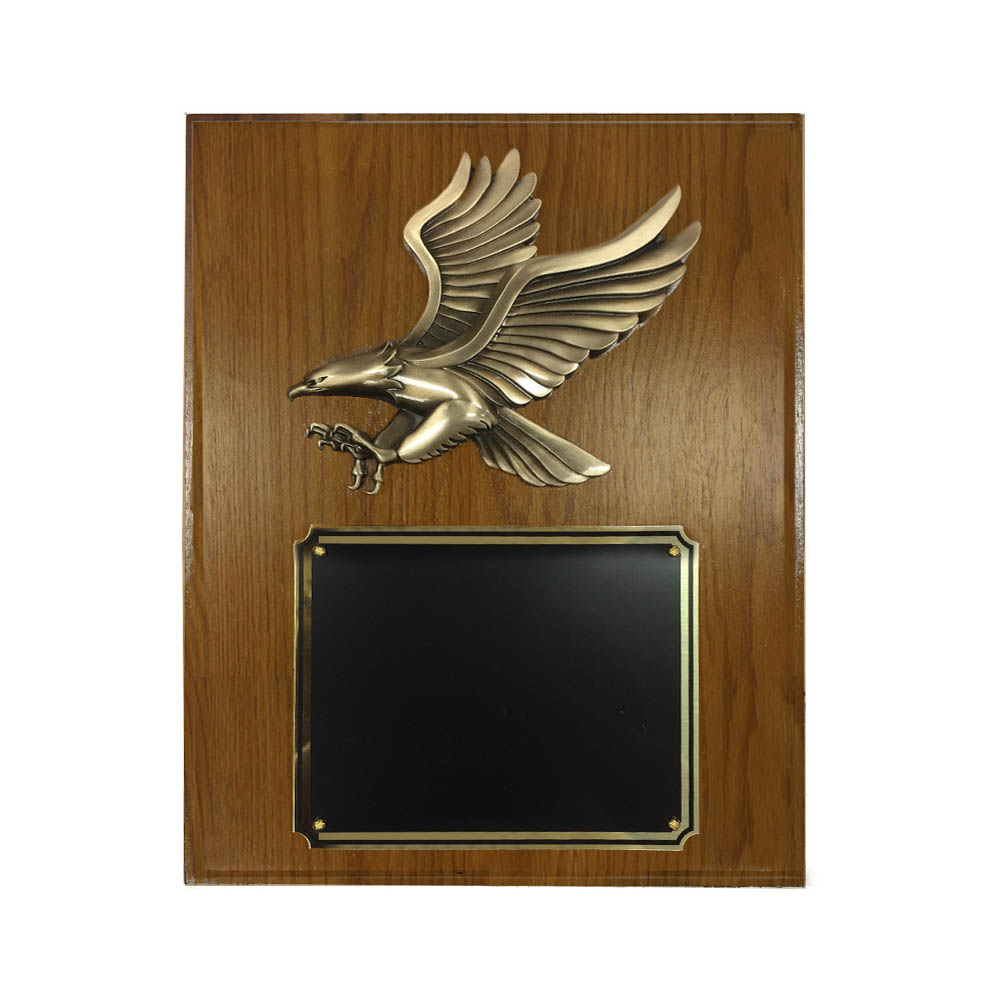 Cherry board award plaque with 4-3/4" brass American Eagle and the option to customize with a gold, silver or black plate with gold trim. The gold and silver plates feature full-color sublimation printing, while the black plate is customized with laser engraving. Total dimension of the award plaque is 8" W x 10" H. Kindly note that the plaque may come with either square or rounded corners, and the plate size may vary as part of the handcrafted manufacturing process, adding to its unique character.