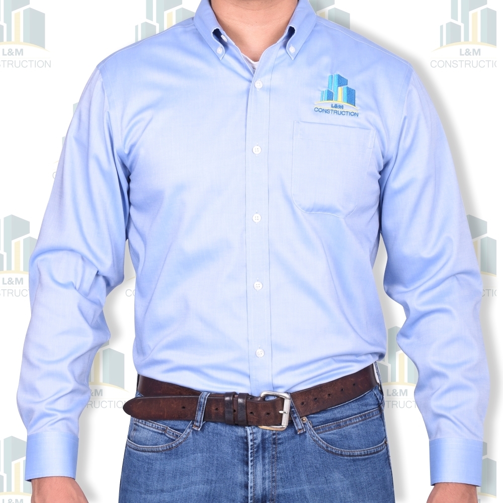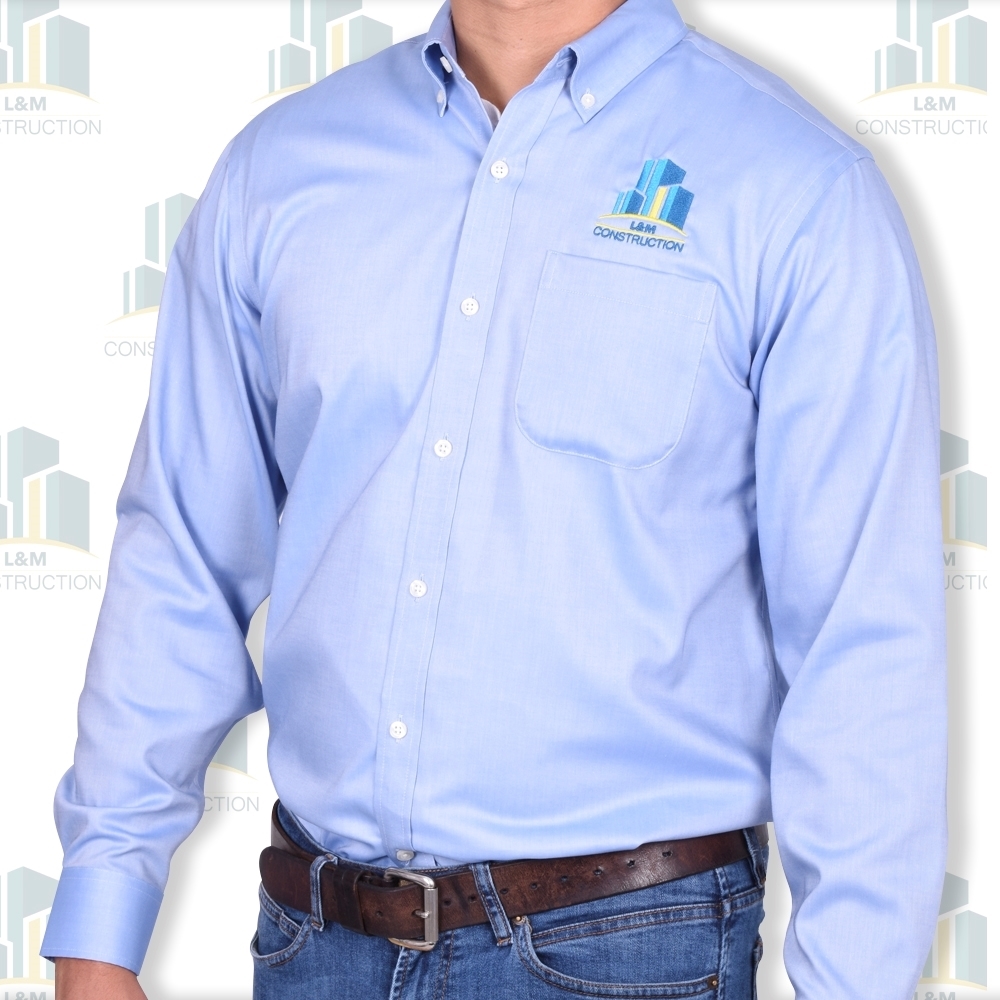 Elegant and lightweight, the Deluxe Pinpoint Oxford non-iron shirt for men (100%) cotton will allow you to be personalized to include your company's embroidered logo. This shirt has a wrinkle-resistant finish with pucker-free taped seams and rounded adjustable cuffs, shirttail hem, button-down collar, left chest pocket and back box pleat. Available colors: charcoal, white, vintage navy, and light blue. Sizes: Small to 3XL.