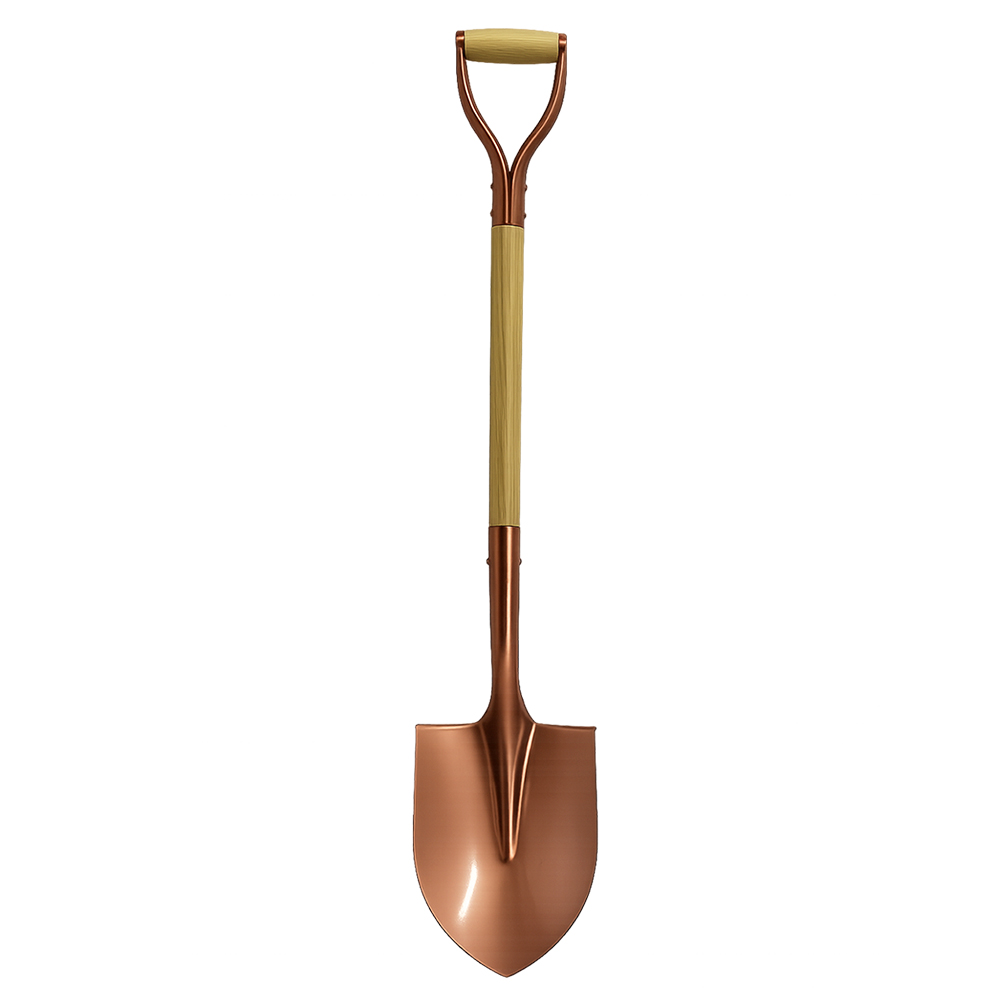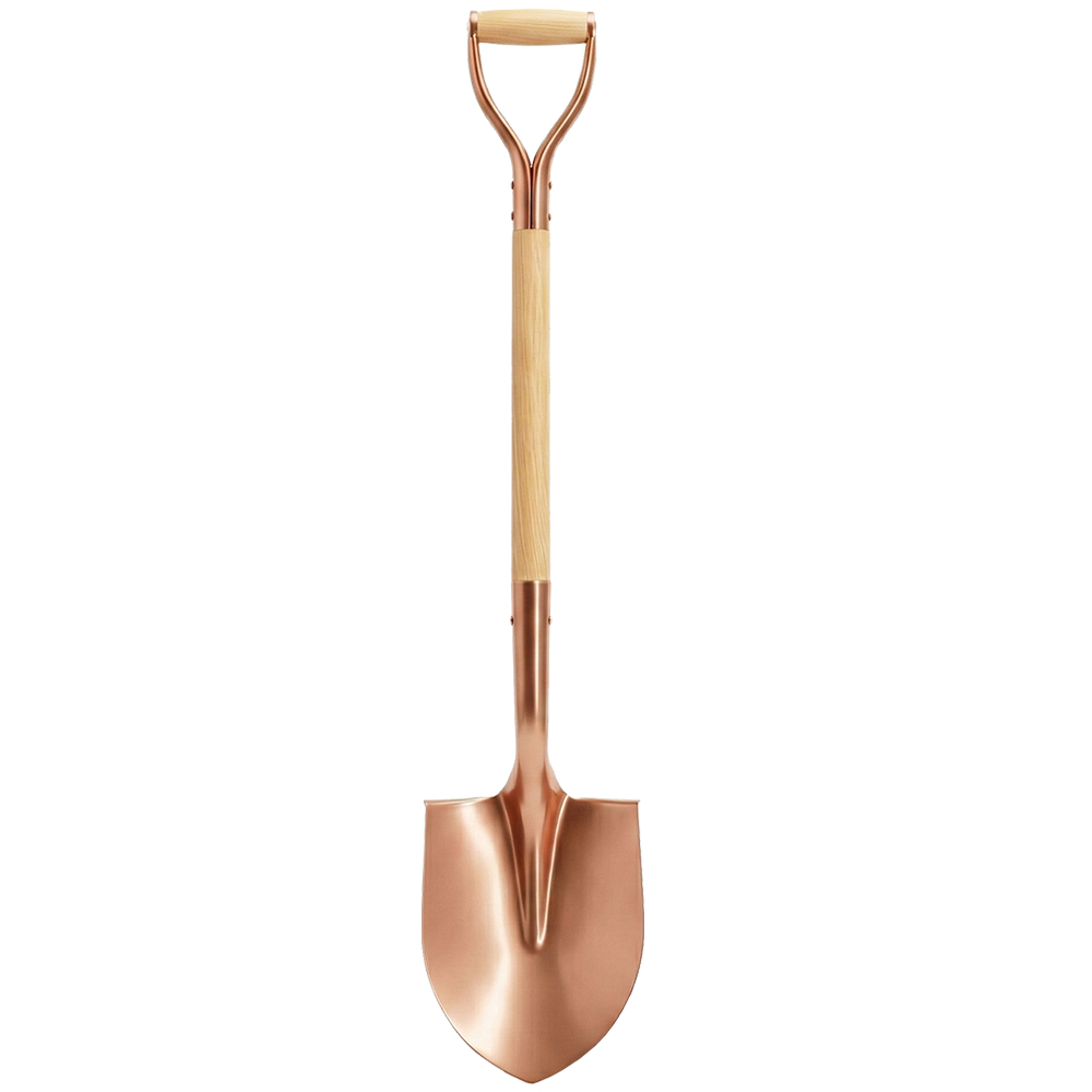 This groundbreaking shovel copper color blade and stem bracket has a traditional D-handle, with a natural wood grip and body, and copper color handle brackets. The ceremonial copper shovel weighs 3.4 pounds, and is 42” tall and 9” wide at the widest point of the blade.