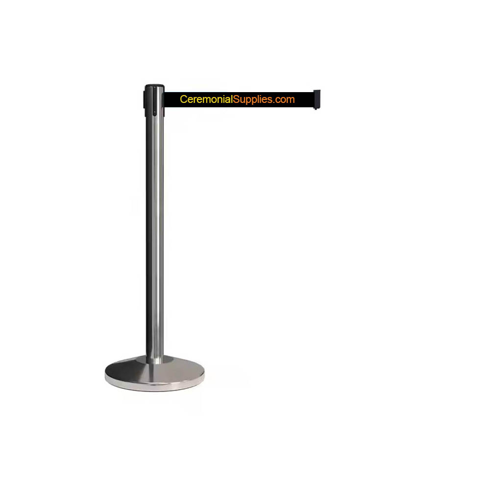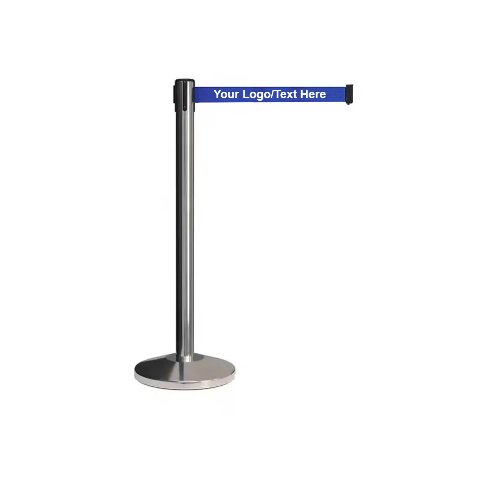 Constructed from premium stainless steel with a sleek mirror finish for a polished, professional appearance. The 11ft belt, 1.97 inches wide, ensures effective crowd control. Choose from red, black, or blue belt colors, and customize it with your branding or messaging for a unique touch. Equipped with internal braking and locking. Sturdy base with a 13.77-inch diameter, featuring built-in rubber floor protectors to prevent slipping or floor damage. Measures 39.37 inches in height and weighs 20 lbs. Retractable belt stanchion sold as a single piece (1).