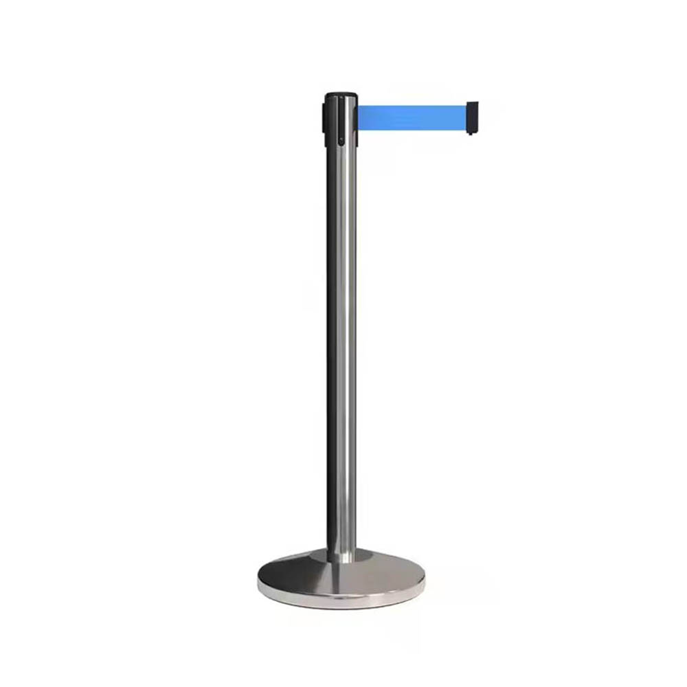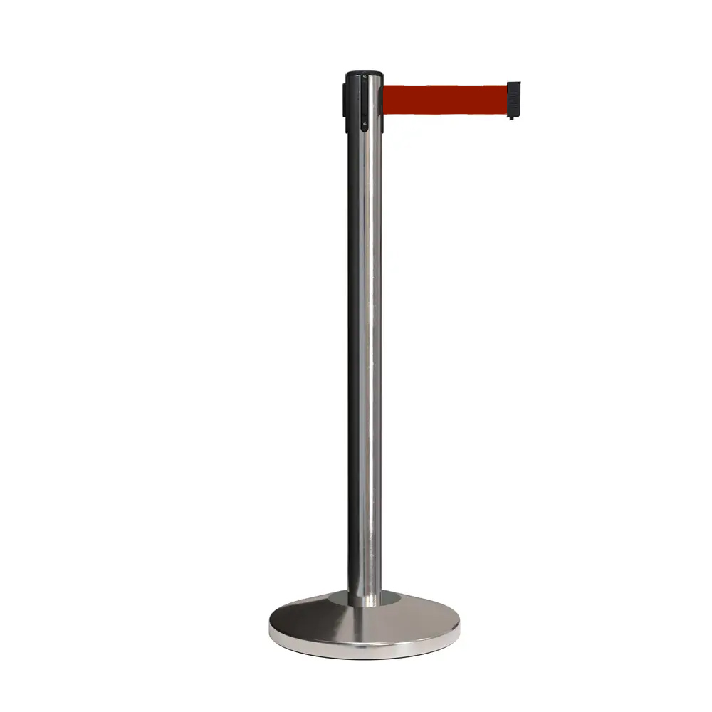 Crafted from high-grade stainless steel, this polished retractable belt stanchion is a stylish and durable solution for crowd management. The post diameter is 3 inches, a height of 39.37 inches and a weight of 20.0 lbs. The cone-shaped base, 14 inches in diameter, features a concrete core with a stainless steel cover and built-in rubber floor protectors for stability and floor safety. The stanchion includes a 16.4 ft customizable retractable belt, available in black, red, or blue, with a 2-inch width. Retractable belt stanchion sold as a single piece (1) .