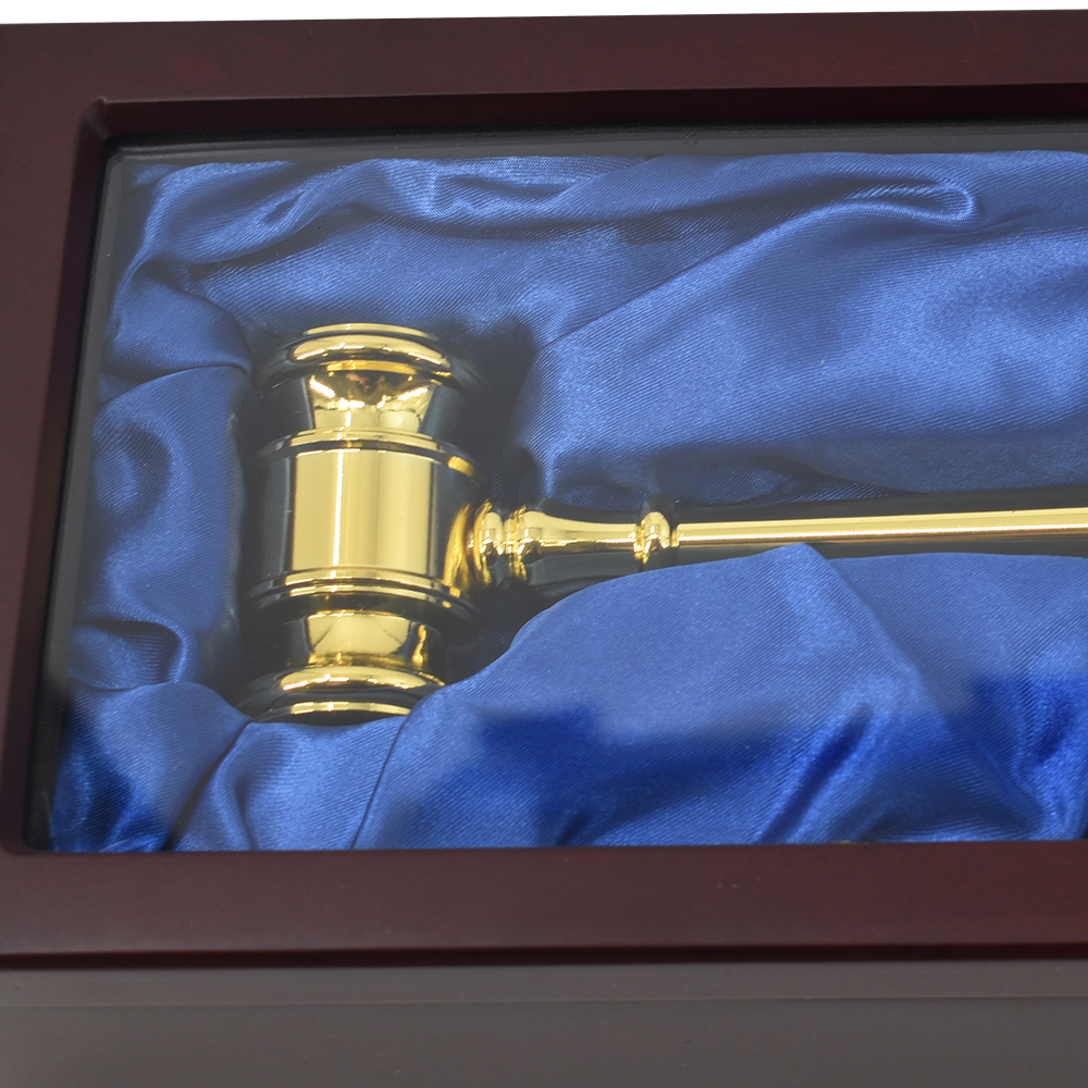 Housed in a lined mahogany-finish gift box, this set arrives ready to impress, making it ideal for retirements, swearing-in ceremonies, or milestone celebrations. More than just a decorative piece, this heirloom-quality gavel symbolizes authority, achievement, and pride in the legal or auctioneering profession. This premium brass gavel set weighs 6 lbs. and measures 11" (L) x 5.5" (W) and 5.5" height, it offers a substantial and impressive feel. It includes a customization plate (1" H x 3" W) for personalization—ideal for a name, date, or single-line message. With its polished presentation, this set makes a striking display piece for desks, offices, or ceremonial settings.