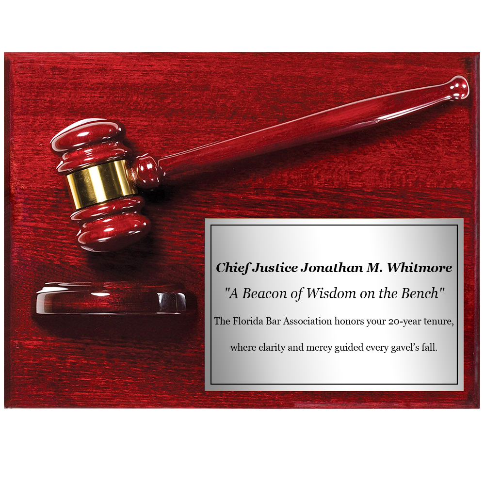 Measuring 9 inches by 12 inches, the plaque provides ample room for meaningful customization and is ideal for honoring judges, attorneys, board members, or court officers—anyone whose leadership and service truly deserve formal recognition. Whether used as a retirement gift, an award of merit, or a ceremonial presentation, this piece delivers a timeless expression of appreciation.