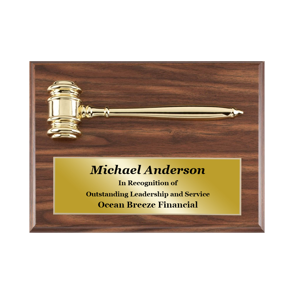 The Gold Gavel Recognition Award Plaque is made of genuine walnut, a masterpiece of craftsmanship designed to honor those who embody leadership and authority. Centered on the rich, polished walnut surface is a mounted full-size metal gavel, meticulously crafted to serve as a powerful symbol of judgment, achievement, and prestige. Weighing 2.8 lbs, this substantial award conveys a sense of importance and permanence, making it an ideal tribute for legal professionals, esteemed judges, accomplished auctioneers, or corporate trailblazers.Personalization is effortless with the option of a black brass plate, offering a canvas for engraved names, dates, or dedications. For those seeking a more vibrant touch, the plaque can also be customized with an optional gold or silver sublimation plate, allowing for full-color designs, logos, or artwork that captures the essence of the honoree’s legacy.