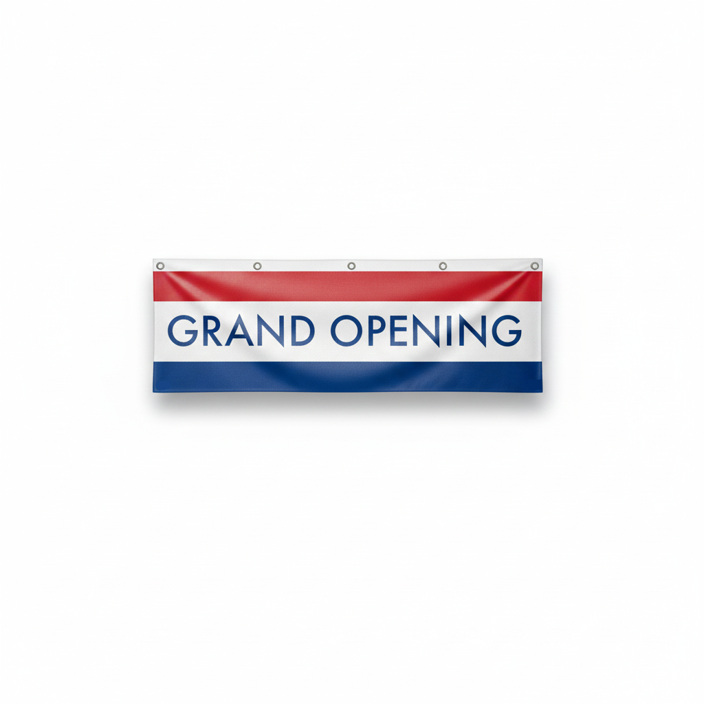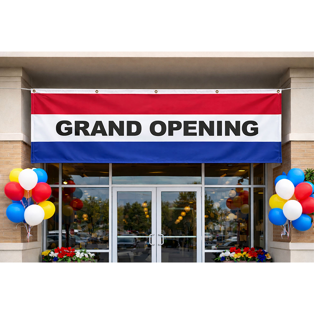 This eye-catching 3'x10' GRAND OPENING flag is the perfect way to announce a new venture in your community or town. Featuring bold black lettering against a stunning backdrop of vibrant red, white, and blue stripes, it captures attention effortlessly. Made from high-quality, durable nylon, this flag is designed to withstand outdoor conditions. Equipped with sturdy brass grommets, it allows for easy and secure hanging. Ideal for grand openings and celebrations, this flag is a spirited declaration of excitement and opportunity, proudly made in the U.S.A.
