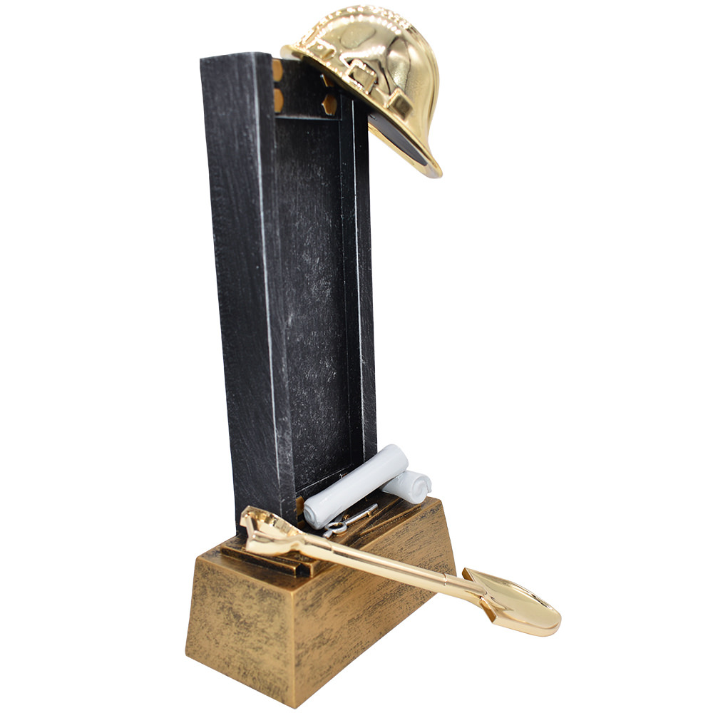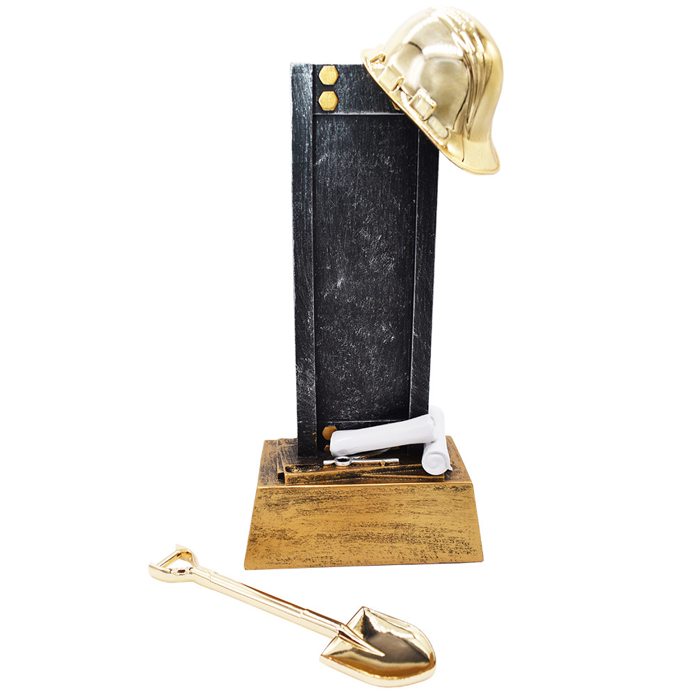 Introducing an elegant Groundbreaking Construction Trophy perfect for recognizing important VIPs and outstanding individuals participating in a first sod-cutting ceremony. Ideal acknowledgement trophy of achievement to recognize those individuals who go above and beyond. A great "thank you" for a job well done and this Ceremonial Groundbreaking Achievement Trophy will acknowledge the valuable contribution of the people who made it possible! The Ceremonial Achievement Trophy is 8.7” tall. It includes a base that features a gold plate for customization of up to 4 lines of text, along with a miniature removable groundbreaking shovel and hard hat in front of a tall slab of concrete.