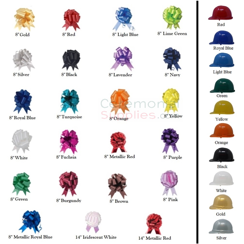 8” Pull Bow comes in gold, silver, royal blue, white, green, orange, red, black, turquoise, fuchsia, burgundy, lavender, lime green, brown, navy, light blue, yellow, and purple.