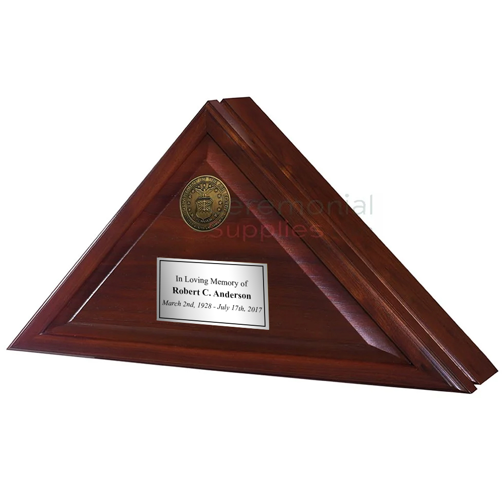 Highest Honor military memorial flag display case 100% hand-crafted in the US from American Walnut wood. Dimensions are 26" L x 13" H x 4 1/2" D and weighs 8 lbs. Built to Federally approved specifications to preserve a memorial 5' x 9.5' flag. Includes option of a 2.5" brass medallion emblem of Air Force, Army, Coast Guard, Marine Corps, Navy, Space Force, or the Great Seal, and has a Velcro friendly insert for medals. Full-color plate in gold, silver, or black with custom text is optional. The flag is not included.