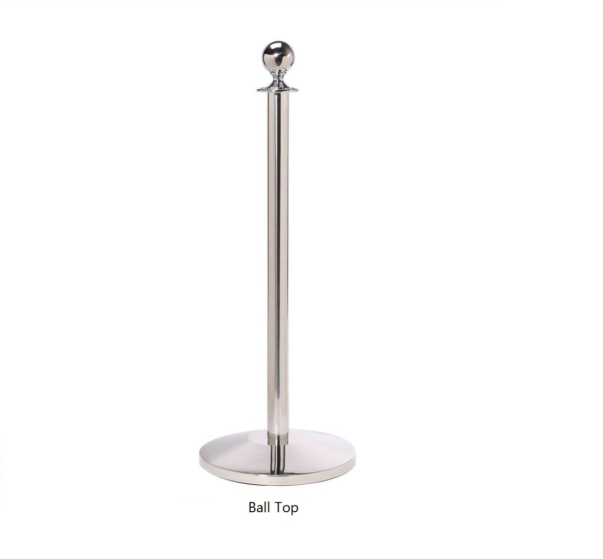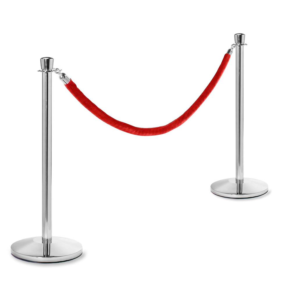 Set includes 2 heavy duty chrome stanchions with Urn/Ball/Flat shaped top and a red velvet rope line with matching hooks. Stanchions are made from stainless steel with a shiny steel finish. Stanchion post measures 39 inches in Height and 14.0 inches in Base Diameter. It is built with a sturdy base and weighs about 20 Lbs (each) with Rubber Floor Protectors. Velvet rope is available in colors Red, Black, and Blue and measures 6 feet in length. Their latch hooks secure the rope to the queue poles. Easy 2-part screw-in assembly is required.
