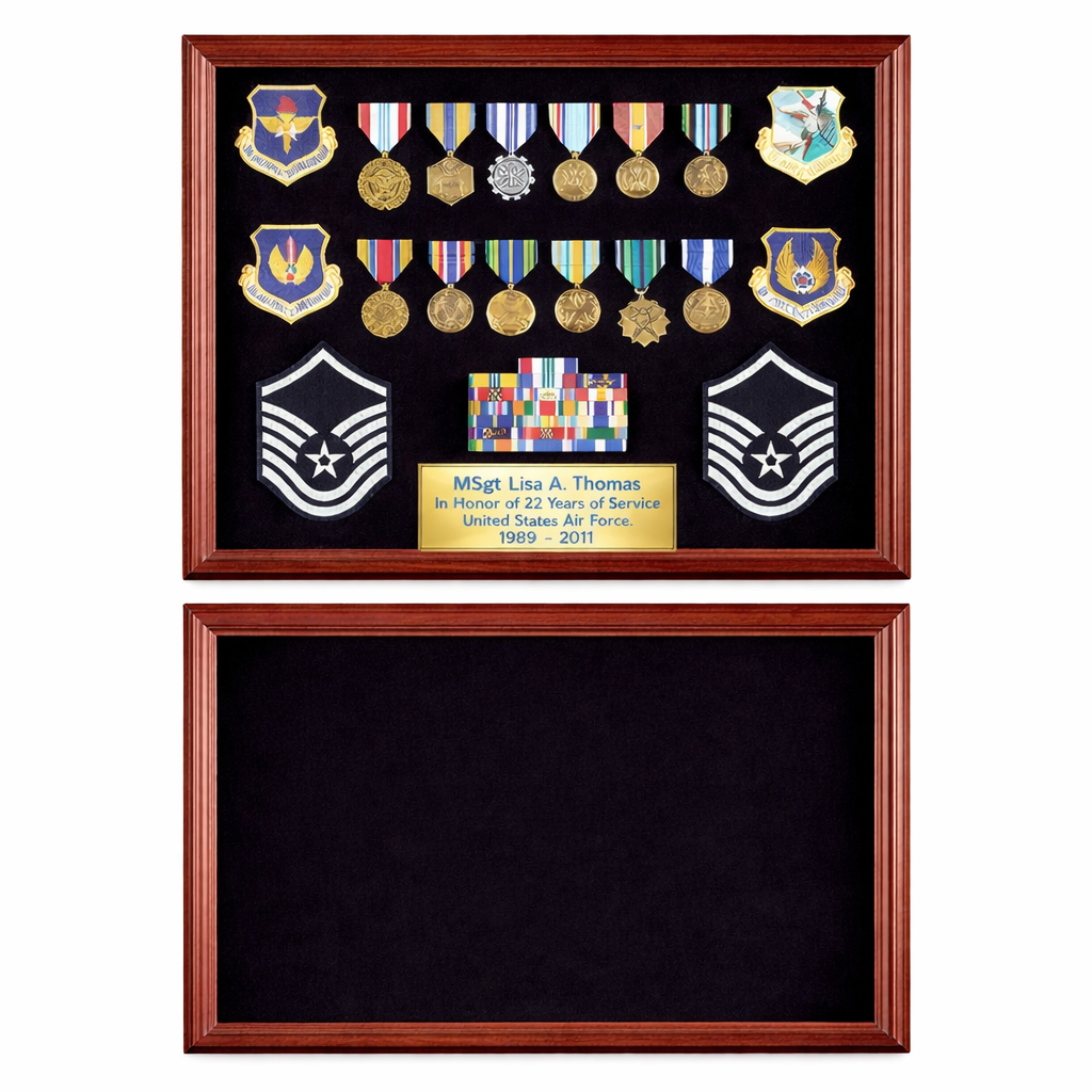 Display your family's military medals in this stylishly crafted cherry-finish shadowbox wood case. Glass-like acrylic cover allows perfect viewing of medals, memorabilia, and certificates and the features a reversible Black/Blue Velcro back panel insert for easy arrangement of items. Optional engraved plate with up to (3) lines of text available for personalizing or customize with a message.