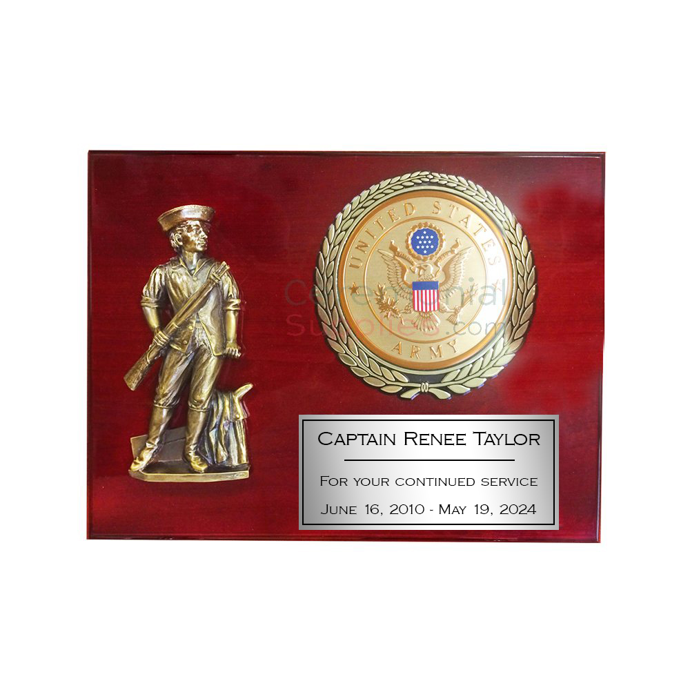 The plaque features a highly attractive cherry finish that features a high gloss finish evoking that of a piano’s keys, and comes with a detailed minuteman alongside a gold wreath and a U.S. Army medallion insert. Also featured is a plate on which you can have your personalised message.