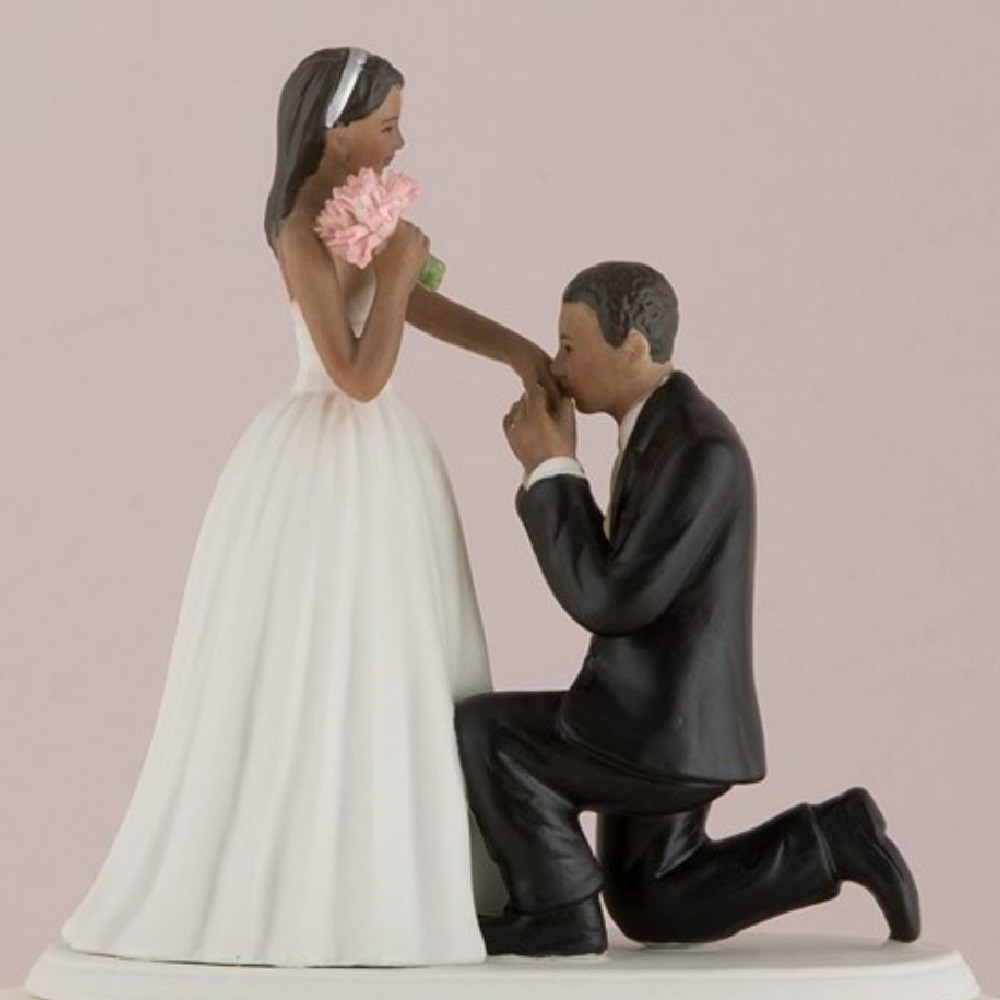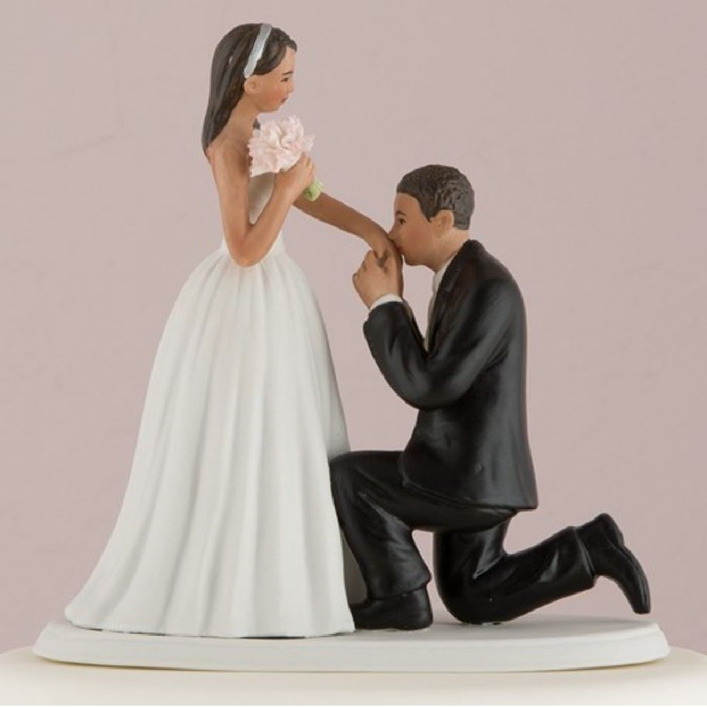 This cake topper comes in a classic wedding pose in which the groom is on one knee asking for the girl’s hand in marriage. Generally, getting down on one knee is a sign of humility and surrender.