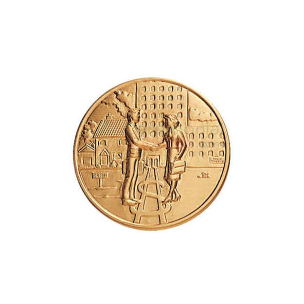 Designed to recognize top producers in real estate sales, this medal features an etched design of a symbolic real estate transaction occurring. The medal measures 2 inches in size and includes a 2.25 inch plain rim medal frame accompanied by a 32 X 1.5 inch ribbon to hang the medal around the neck. The colors you can choose from when it comes to the ribbon are blue, red, white, green, gold, black, and purple.