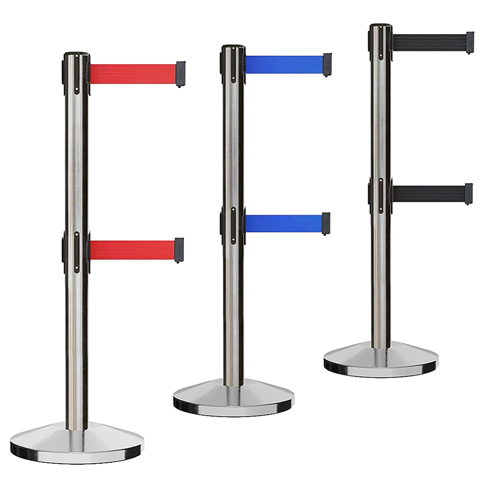 Ensure efficient crowd management with our Dual-Belt Retractable Heavy Duty Black Stanchion Post. Crafted from durable stainless steel, each post stands 39.37 inches tall with a 2.99-inch diameter, providing a sturdy and reliable barrier system. The dual retractable belts, each measuring 1.96 inches in width and extending up to 8 feet, are available in black, red, or blue, allowing for clear and customizable queue delineation. The 14-inch diameter base is constructed of concrete with an ABS cover and includes built-in rubber floor protectors to prevent scuffs and maintain floor integrity. Additionally, the top-mounted cartridge features a 4-way connection, offering versatile setup configurations to suit various crowd control needs. With a total weight of 20.94 pounds, these stanchions are both stable and portable, ideal for managing queues in diverse environments. Includes one single stanchion.