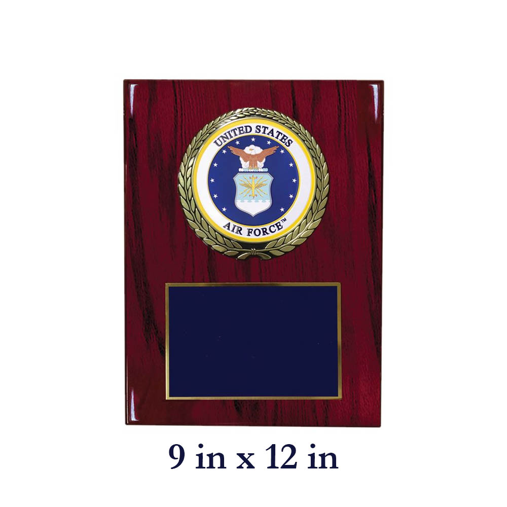 Glossy cherry finish quality crafted plaque available in 2 size options: 8" x 10" or 9" x 12" with US Air Force medallion 4" in diameter and a blue and gold plate for engraving up to 5 lines of text, or gold and silver plates with full-color sublimation printing.