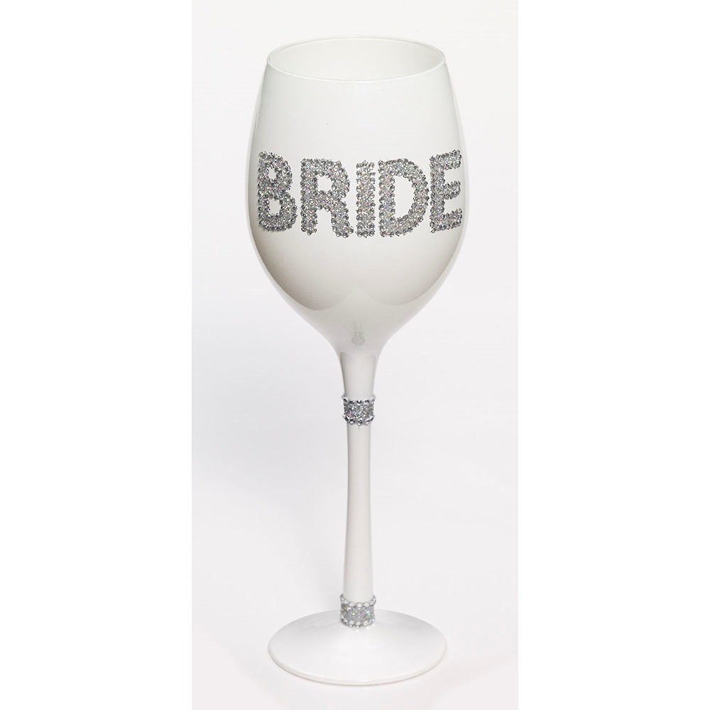 Wedding Bride/Groom Decorative Wine Glasses measures 9 inches in height. They are made of real glass. Groom wine glass is painted black with silver embellishments that spell out the words “Groom”. Bride wine glass is painted white with silver embellishments that spell out the word “Bride”.