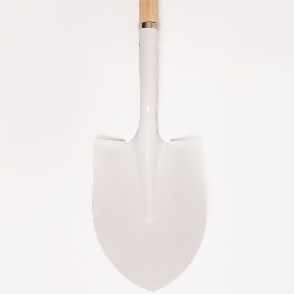 White colored Steel head ceremonial Groundbreaking shovel with white D-style handle on wood grip. 42" high and 9.5" wide shovel head. Grip and stem are American ash wood. The shovel stem and handle can be customized with direct print or vinyl decal, handle can also be customized with a 5"x2" mounted plate. A single-color Vinyl decal is the only option for the shovel head.
